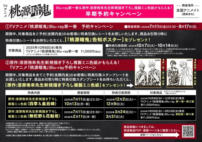 【BD予約情報】 TVアニメ『桃源暗鬼』 第一巻 予約受付中コォ✨✨ 📣第一巻 予約キャンペーンは8/17(日)まで‼️‼️ 🎁早期予約特典:『桃源暗鬼』告知ポスター#桃源暗鬼 🔽バーコード提示で簡単予約