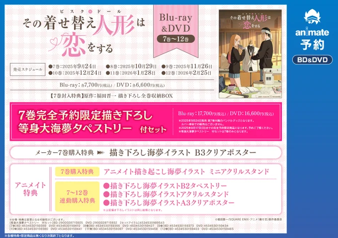 【BD/DVD予約情報】 📢予約受付は8/17(日)まで‼️‼️ TV その着せ替え人形は恋をする 7【完全生産限定版】バンドルグッズ付 予約受付中コォ✨✨ 7巻完全予約限定描き下ろし等身大海夢タペストリー付ですコォ‼️‼️ #着せ恋アニメ #着せ恋 🔽バーコード提示で簡単予約 animate-onlineshop.jp/pd/316…