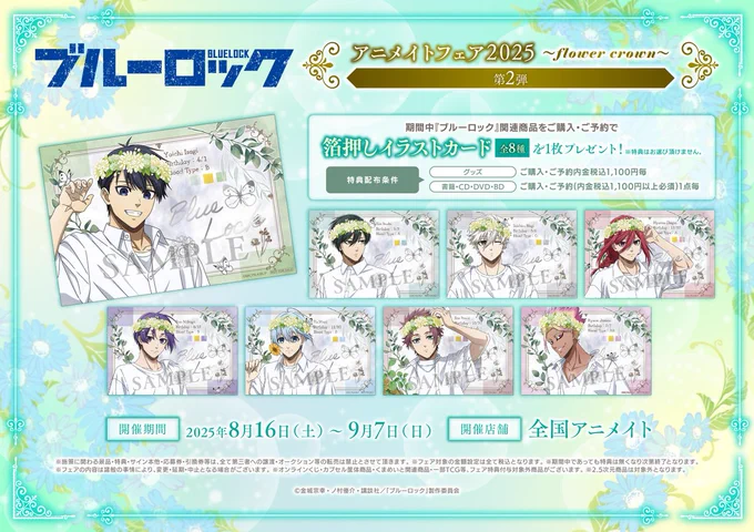 【フェア情報】 TVアニメ『ブルーロック』アニメイトフェア2025 ~flower crown~ 本日≪16日~≫開催ですコォ🎉 期間中、フェア条件を満たしたお客様に、≪ブロマイド(全8種)≫を1枚プレゼント🎁✨ #ブルーロック 🔻詳細はこちら🔻 animate-onlineshop.jp/conten…