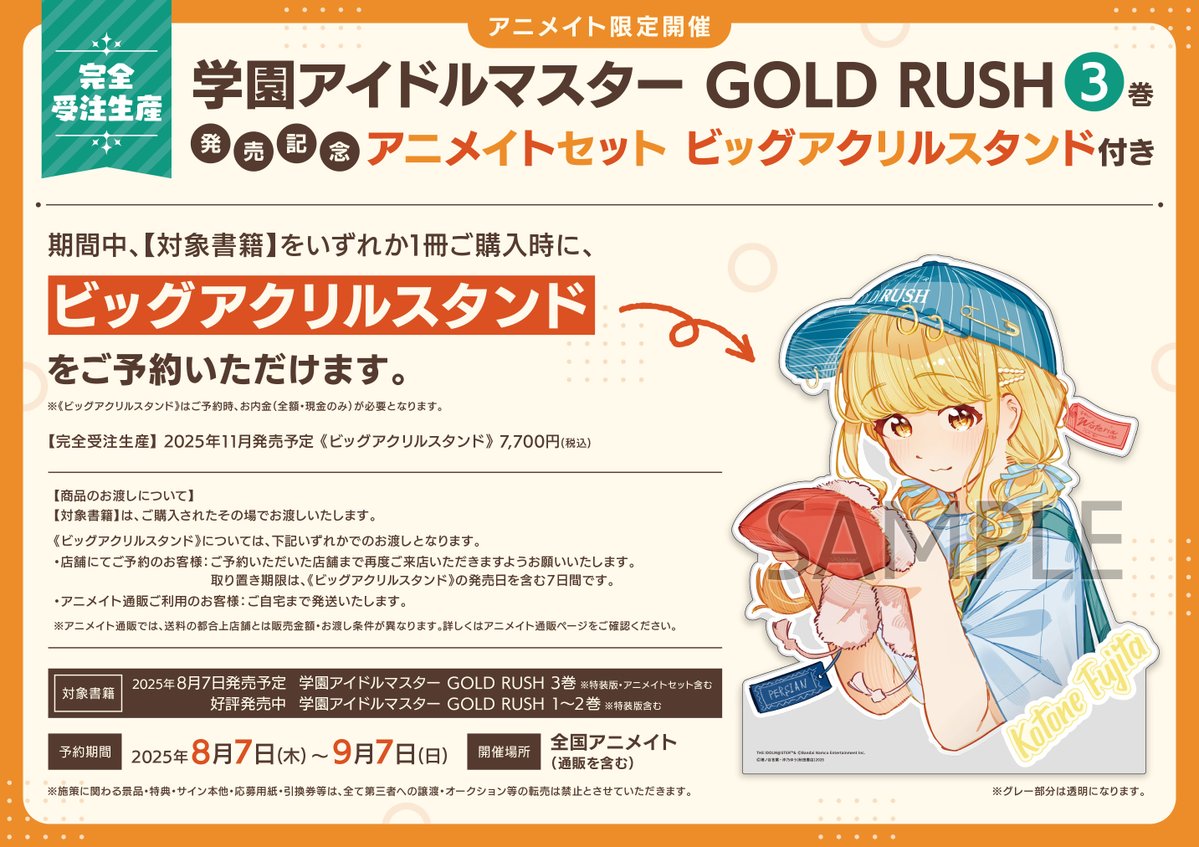 【完全受注生産】 本日より‼️ コミックス「学園アイドルマスター GOLD RUSH」3巻 発売記念 アニメイトセット ビッグアクリルスタンド付き 開催コォ🎉 🔽詳しくはコチラ🔽