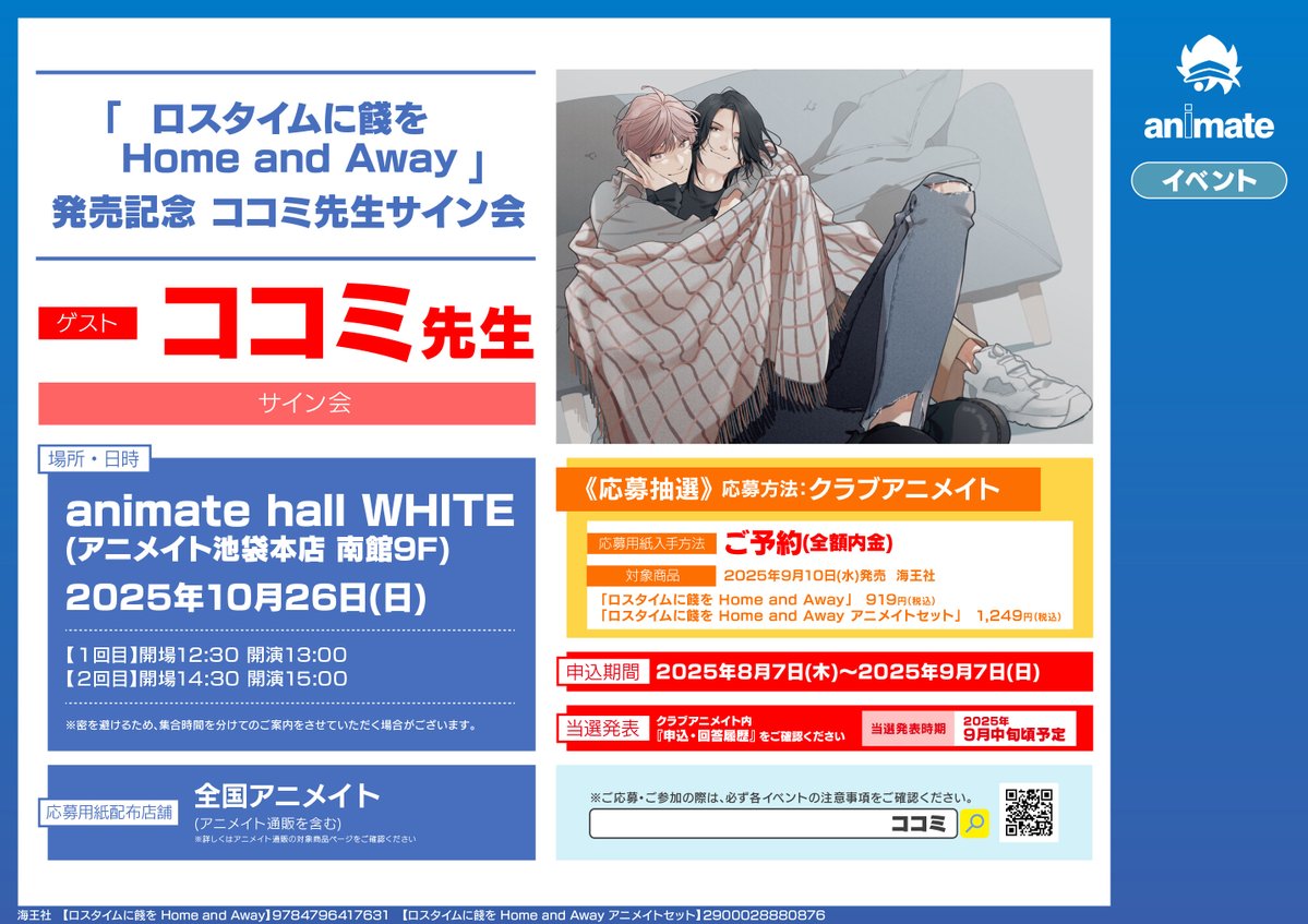 【書籍イベント情報】 『「ロスタイムに餞を Home and Away」発売記念 ココミ先生サイン会』開催決定コォ🎉 期間中、対象商品のいずれか1点をご予約(全額内金)いただいたお客様に【応募シリアル】をお渡し🎁 #ココミ 先生 #ロスタイムに餞を 🔽詳しくはコチラ🔽