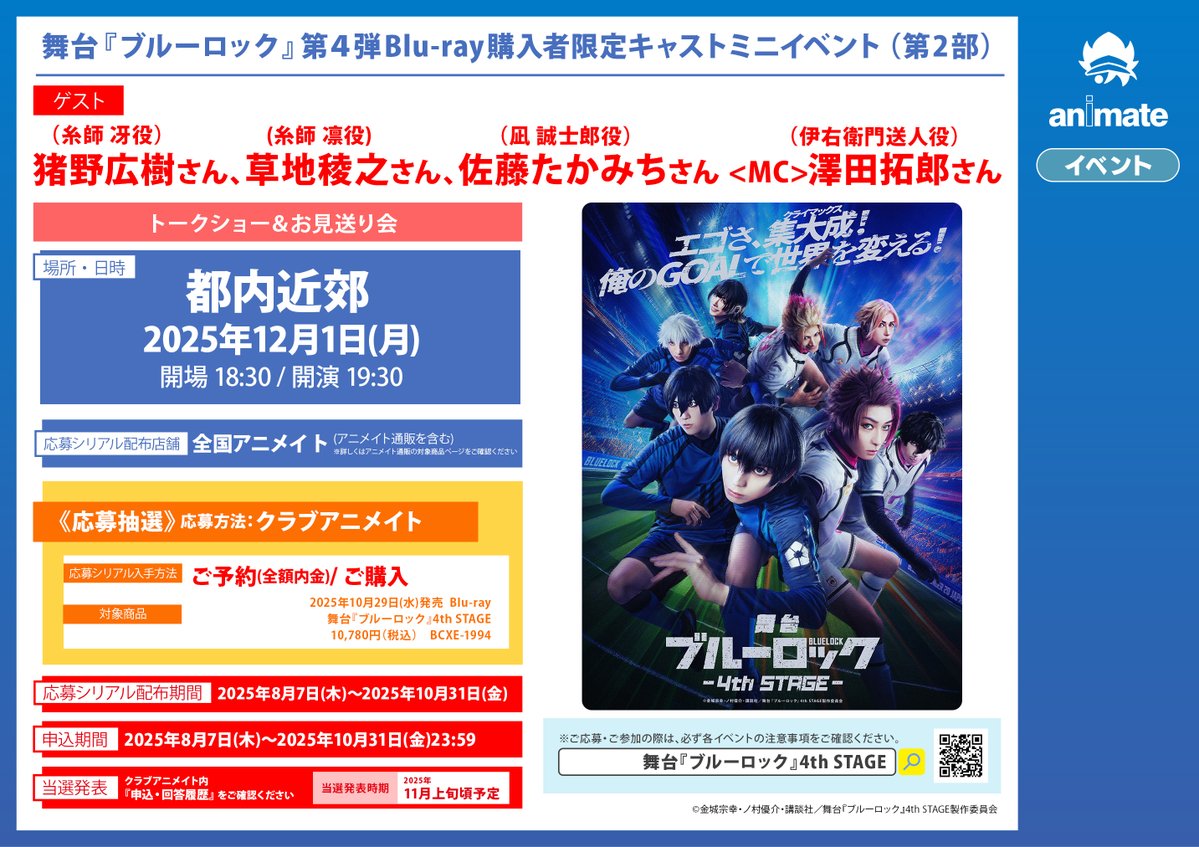 【イベント情報】 舞台『ブルーロック』第4弾Blu-ray購入者限定キャストミニイベント(第2部) 開催決定コォ‼️‼️ 期間中、対象商品を全額内金ご予約またはご購入いただいたお客様に応募シリアルをお渡しいたしますコォ✨✨ #ブルーロック #ブルステ 詳細は🔽POPをチェック