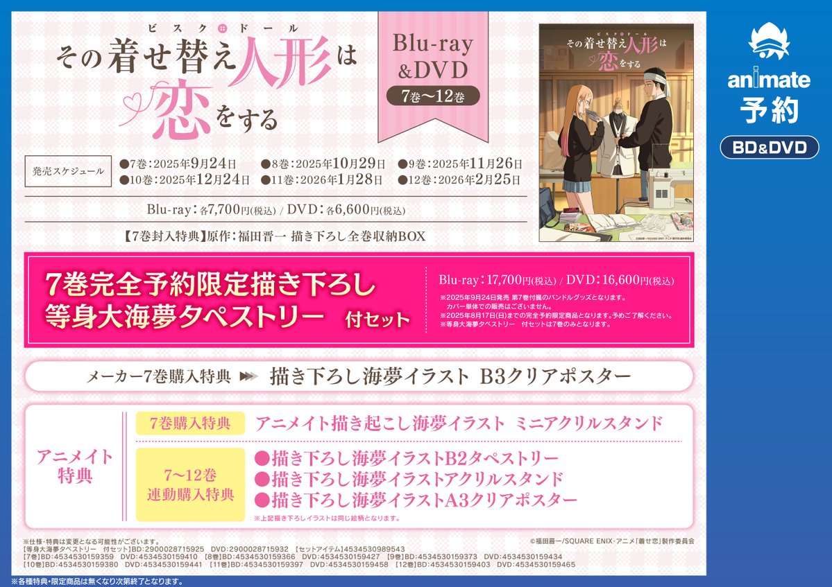 【BD/DVD予約情報】 その着せ替え人形は恋をする 7巻~12巻 予約受付中コォ✨✨ 『7巻完全予約限定描き下ろし等身大海夢タペストリー付セット』もありますコォ‼️‼️ #着せ恋アニメ #着せ恋 🔽バーコード提示で簡単予約 animate-onlineshop.jp/pd/3165823/?ut…