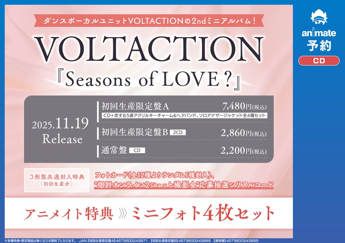 【CD予約情報】 #VOLTACTION『Seasons of LOVE?』 予約受付中コォ‼️‼️ 🎁アニメイト特典:ミニフォト4枚セット 発売記念トークイベント開催決定コォ‼️ 期間中、全額内金ご予約またはご購入で応募シリアルをお渡しコォ✨✨ #にじさんじ バーコード提示で簡単予約 animate-onlineshop.jp/pd/3184072/?ut…