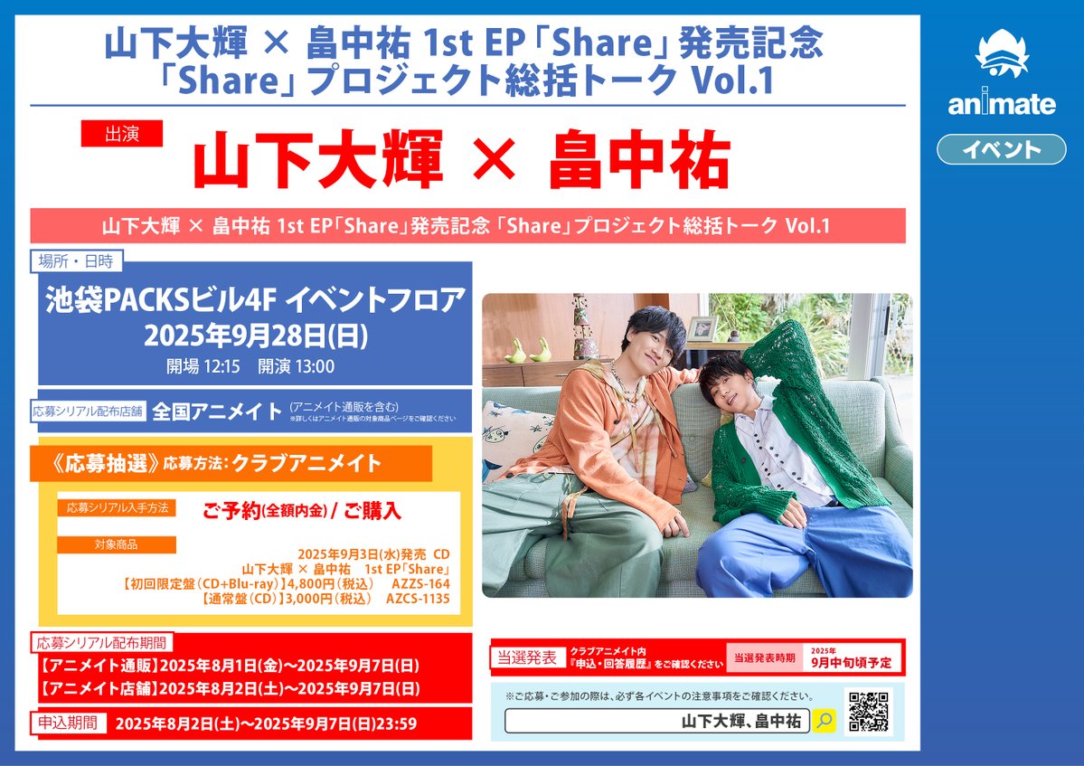 【イベント情報】 山下大輝 × 畠中祐 1st EP「Share」発売記念 「Share」プロジェクト総括トーク Vol.1 開催決定コォ‼️‼️ 期間中、対象商品のいずれか1点を、全額内金ご予約またはご購入いただいたお客様に応募シリアルをお渡しいたしますコォ✨✨ 詳細は🔽POPをチェック