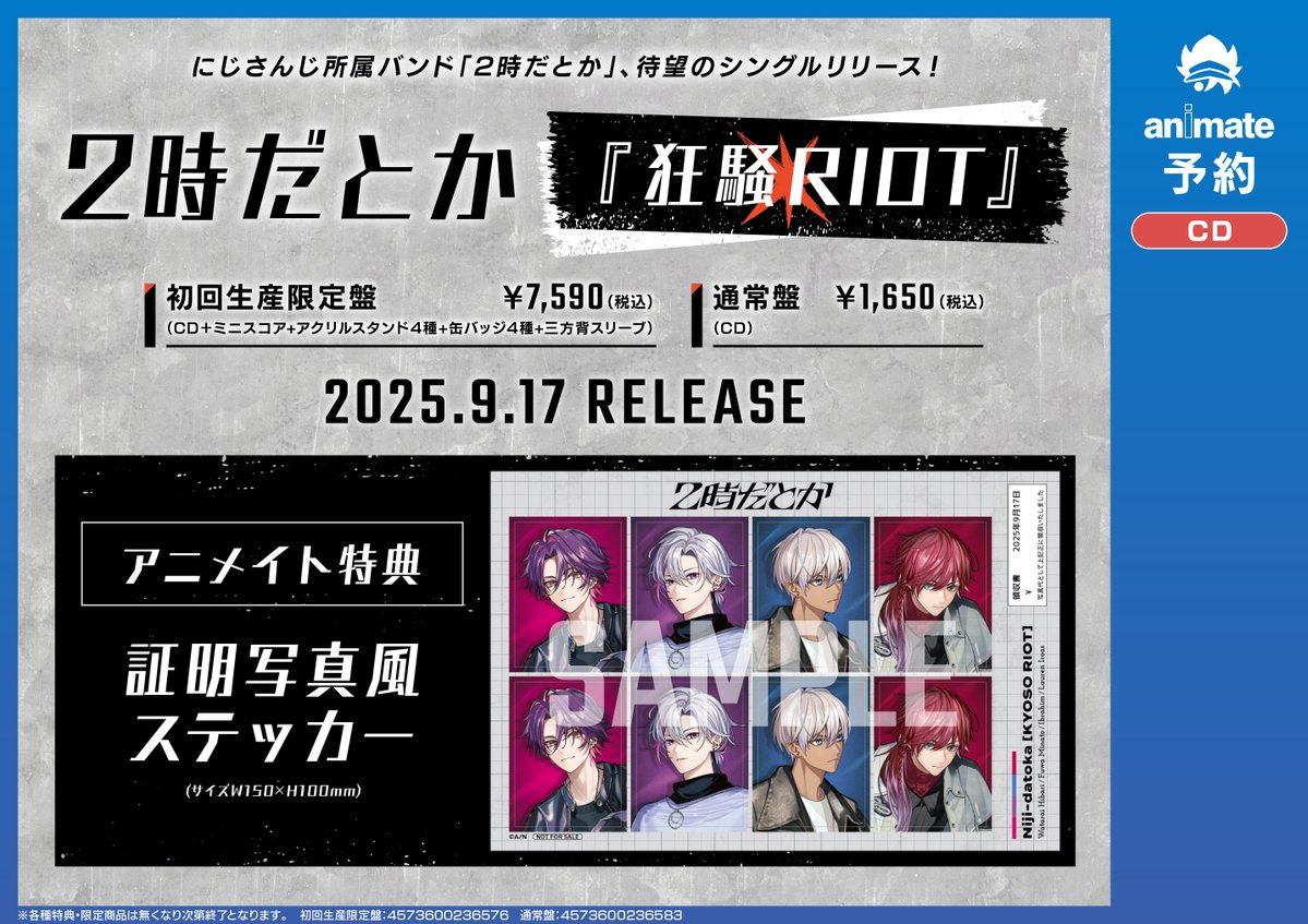 【CD予約情報】 #2時だとか「狂騒RIOT」 予約受付中コォ🎵🎵 🎁アニメイト特典:証明写真風ステッカー 10/5までの期間中、全額内金ご予約またはご購入でトークイベントの応募シリアルをお渡しいたしますコォ‼️‼️ #にじさんじ 🔽バーコード提示で簡単予約 animate-onlineshop.jp/pd/3140089/?ut…