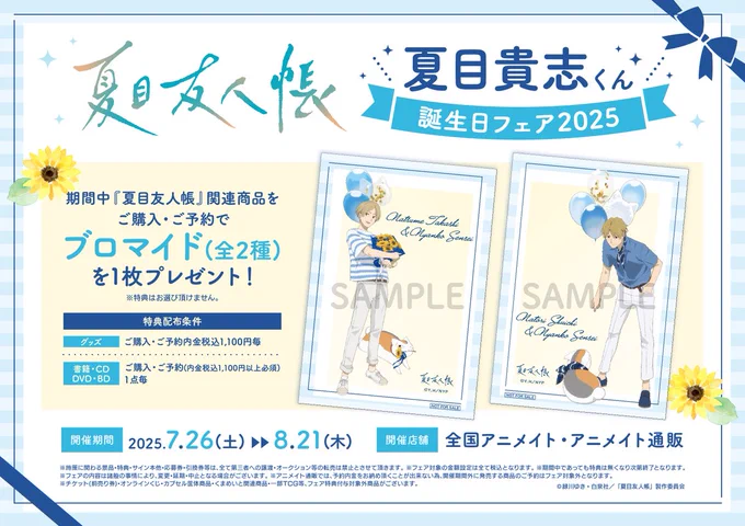 【フェア情報】 『夏目友人帳』夏目貴志くん誕生日フェア2025 本日≪26日~≫開催ですコォ🎉 期間中、フェア条件を満たしたお客様に、≪ブロマイド(全2種)≫をプレゼント🎁✨ #夏目友人帳 🔻詳細はこちら🔻 animate-onlineshop.jp/conten…
