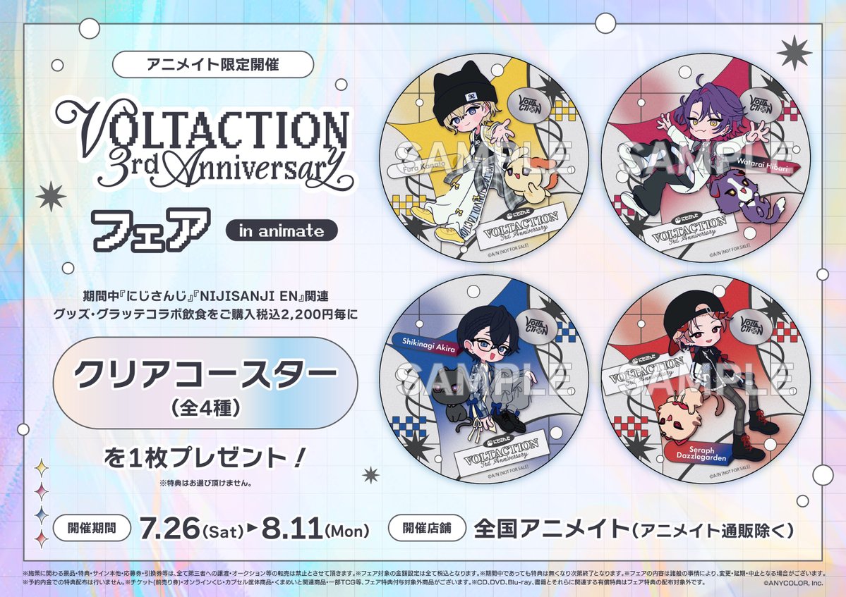 【フェア情報】 にじさんじ VOLTACTION 3rd Anniversary フェア in animate 明日≪26日~≫開催ですコォ🎉 期間中、フェア条件を満たしたお客様に、≪クリアコースター(全4種)≫を1枚プレゼント🎁✨ #にじさんじ 🔻詳細はこちら🔻 animate-onlineshop.jp/contents/fair_…