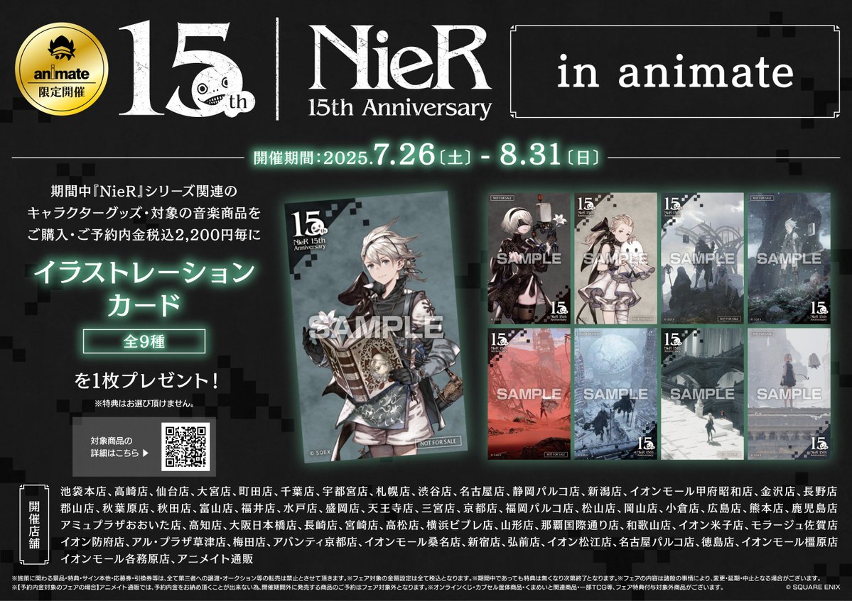 【フェア情報】 NieR 15th Anniversary in animate 明日≪26日~≫開催ですコォ🎉 期間中、フェア条件を満たしたお客様に、≪イラストレーションカード(全9種)≫をプレゼント🎁✨ #NieR 🔻詳細はこちら🔻 animate-onlineshop.jp/contents/fair_…
