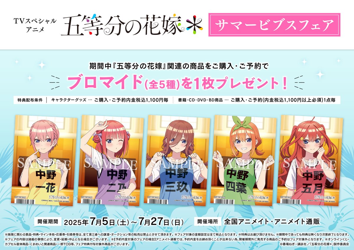 【フェア情報】 ‼フェアは7月27日まで‼ TVスペシャルアニメ「五等分の花嫁*」サマービブスフェア まもなく終了ですコォ 期間中、フェア条件を満たしたお客様に、特典≪ブロマイド(全5種)≫をプレゼント🎁✨ 🔻詳細はこちら🔻 animate-onlineshop.jp/contents/fair_…