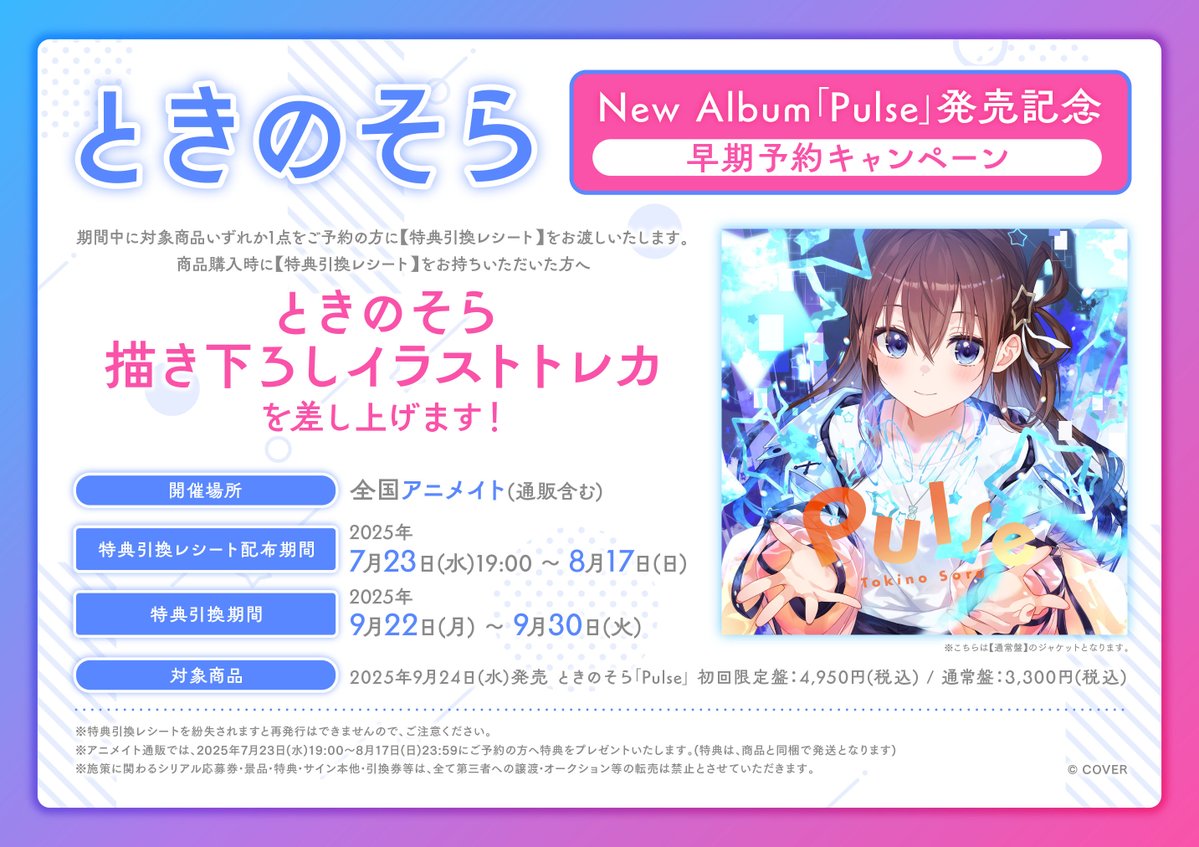 【フェア情報】 『ときのそら New Album「Pulse」発売記念 早期予約キャンペーン』 開催中コォ🎵🎵 8/17までの期間中、対象商品をご予約で商品引取り時、「描き下ろしイラストトレカ」をお渡しコォ✨✨ ※限定生配信イベントシリアルのお渡し対象外となります※ 詳細は🔽POPをチェック