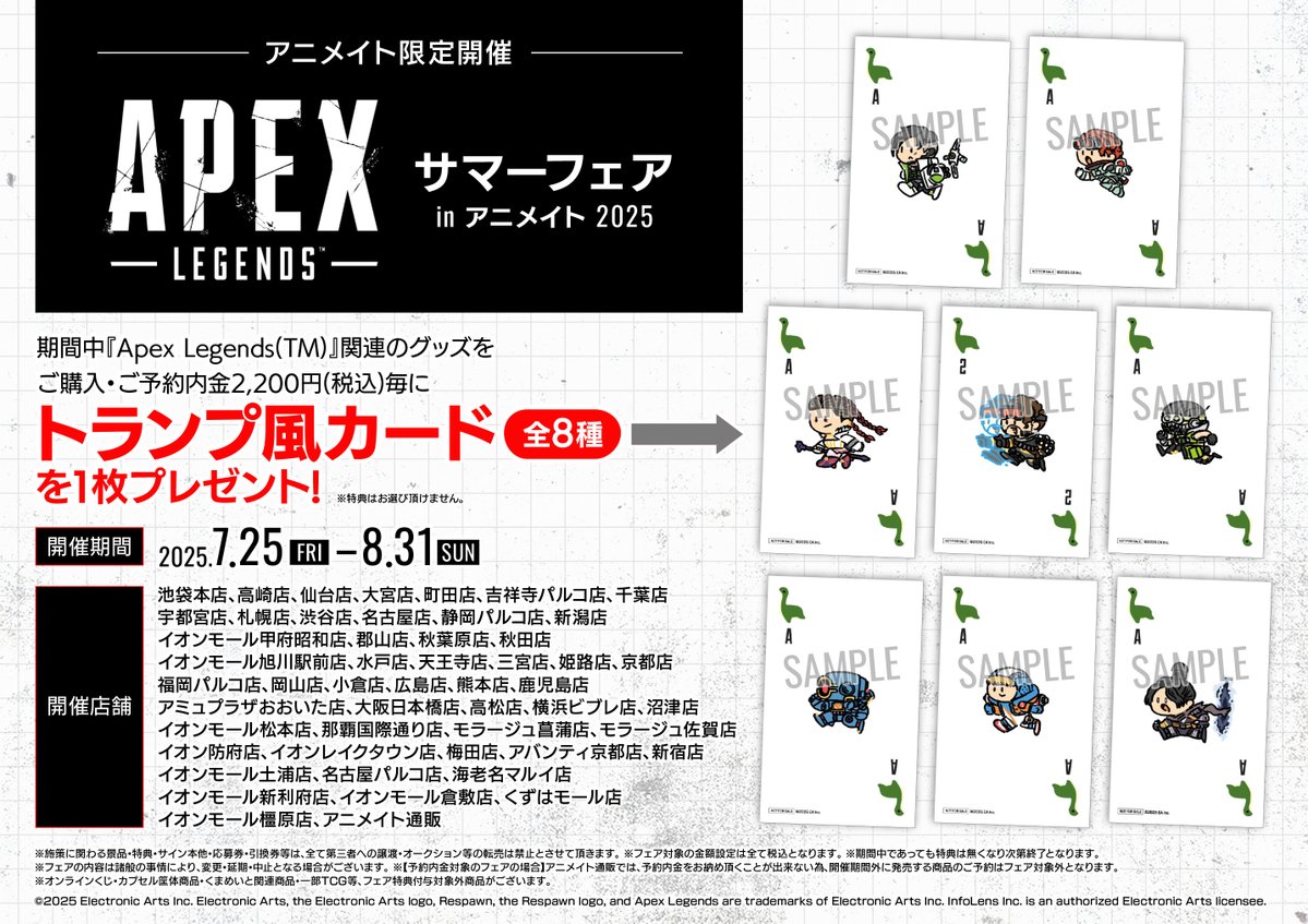 【フェア情報】 Apex Legends(TM) サマーフェア in アニメイト 2025 明日≪25日~≫開催ですコォ🎉 期間中、フェア条件を満たしたお客様に、≪トランプ風カード(全8種)≫を1枚プレゼント🎁✨ #Apex 🔻詳細はこちら🔻 animate-onlineshop.jp/contents/fair_…