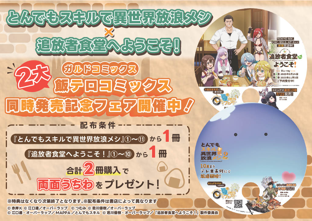 【書籍フェア情報】 本日より 「2大飯テロコミックス 新刊同時発売記念フェア」 が開催ですコォ‼️ 期間中、『とんでもスキルで異世界放浪メシ』①~⑪から1冊、『追放者食堂へようこそ』①~⑩から1冊の、合計2冊購入で【両面うちわ】を1点プレゼント🎁 🔽詳細は下記の画像をチェック🔽