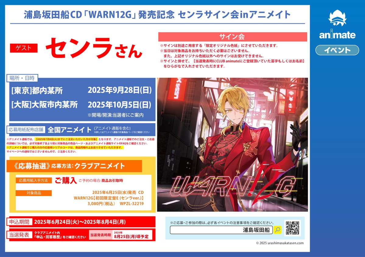 【✨応募受付中✨】 #浦島坂田船 #センラ 浦島坂田船CD「WARN12G」発売記念 センラサイン会inアニメイト お申込みは[8月4日(月)]まで! ※アニメイト店頭では、お取り寄せ(全額内金※現金のみ)」でも応募シリアルをお渡しできます! ぜひご利用ください🌸 詳細はこちら⇓ animate-onlineshop.jp/contents/fair_…