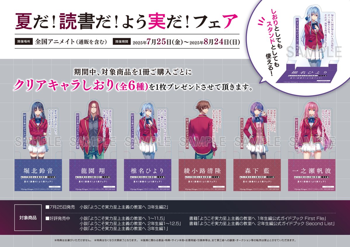 【書籍フェア情報】 7月25日より 『夏だ!読書だ!よう実だ!フェア』 の開催が決定ですコォ🌟 期間中、対象商品1冊ご購入毎に【クリアキャラしおり(全6種)】を1枚プレゼント🎁 🔽詳細は下記の画像をチェック🔽