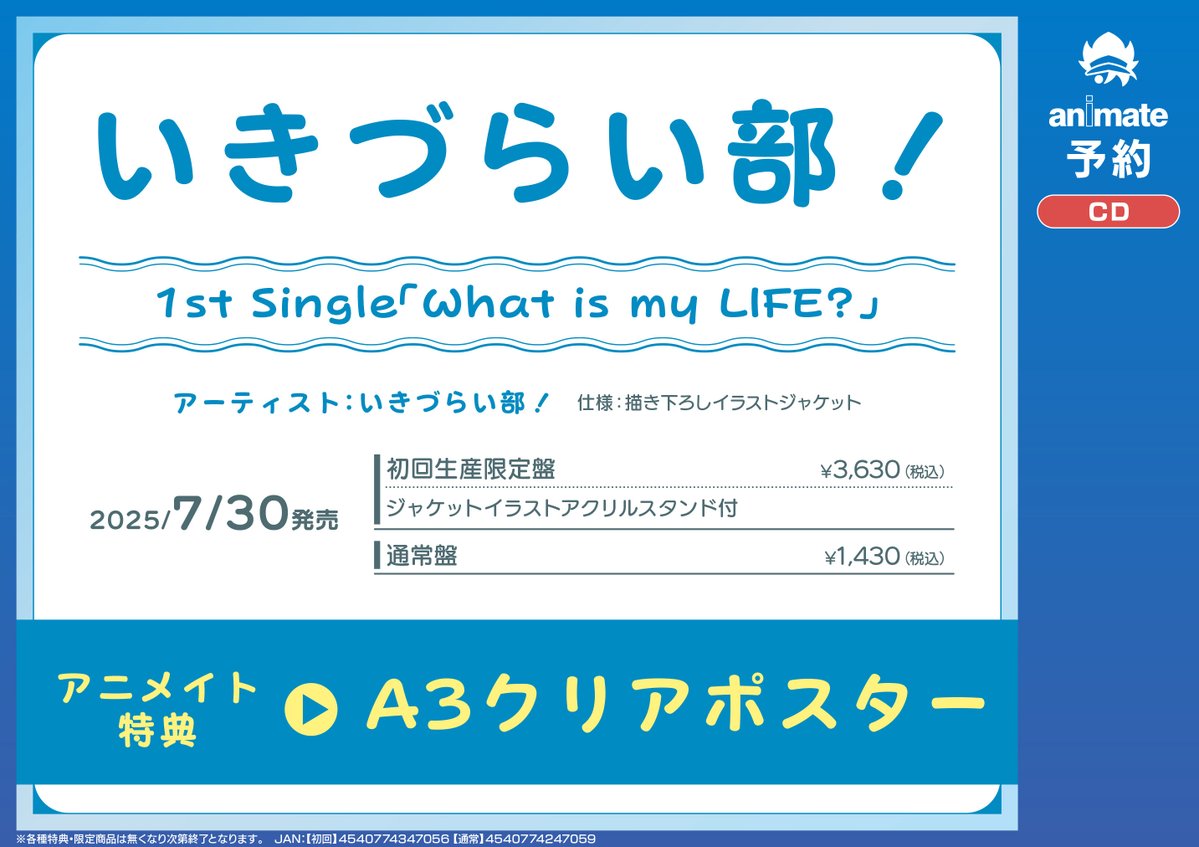 【CD予約情報】 ラブライブ! イキヅライブ! LOVELIVE! BLUEBIRD いきづらい部! 1st Single「What is my LIFE?」 予約受付中コォ🎵🎵 🎁アニメイト特典:A3クリアポスター #イキヅライブ! #いきづらい部! 🔽バーコード提示で簡単予約 animate-onlineshop.jp/pd/3130471/?ut…