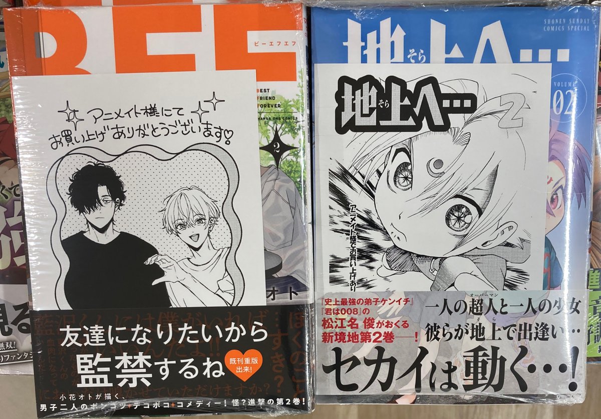 【書籍新刊情報】 「#BFF 2」 「#地上へ・・・ 2」 が入荷しましたコォ🎶 購入特典【メッセージシート】がございます #小花オト 先生 #松江名俊 先生 新刊コーナーにて発売中‼️