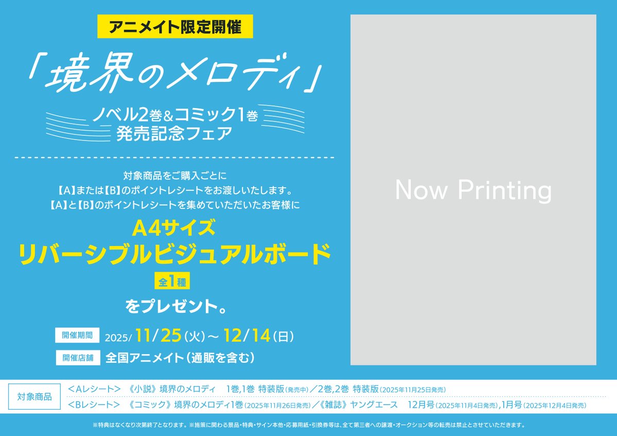 【書籍フェア情報】 『「境界のメロディ」ノベル2巻&コミック1巻発売記念フェア』開催決定コォ❗️ 対象商品を購入ごとに【A】または【B】のポイントレシートをお渡し💕 【A】と【B】のポイントレシートを集めた方に【A4サイズリバーシブルビジュアルボード(全1種)】をプレゼント🎁 🔽詳細はこちら🔽