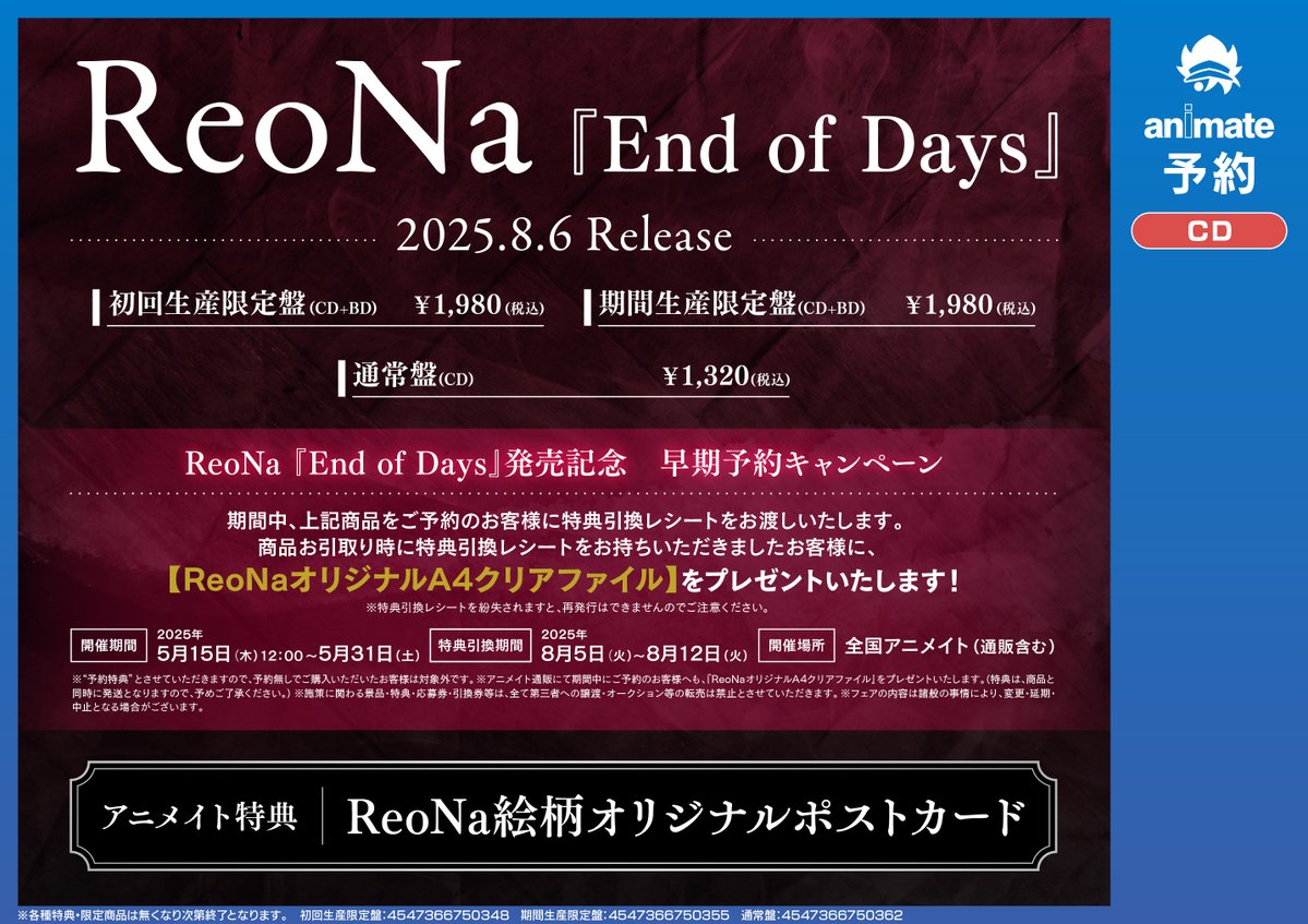 【フェア情報】 #ReoNa 『End of Days』発売記念 早期予約キャンペーン 開催中コォ‼️‼️ 期間中、対象商品をご予約いただいたお客様に商品お引き取り時、【ReoNaオリジナルA4クリアファイル】をプレゼントいたしますコォ✨✨ 🔽バーコード提示で簡単予約 animate-onlineshop.jp/pd/3128022/?ut…