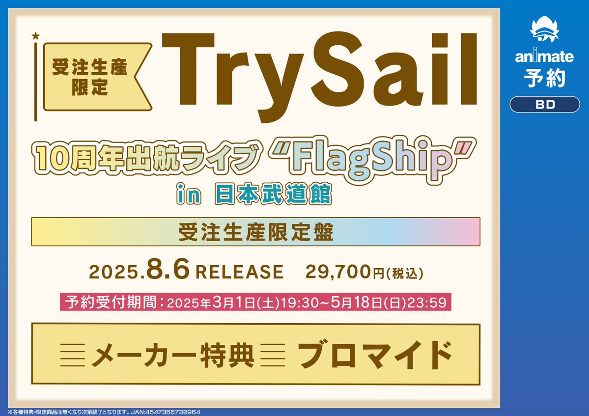 【BD予約情報】 📢受注期間は5/18(日)まで‼️‼️ #TrySail 10周年出航ライブ “FlagShip” in 日本武道館 受注生産限定盤 予約受付中コォ🎵🎵 🎁メーカー特典:ブロマイド 🔽バーコード提示で簡単予約 animate-onlineshop.jp/pd/3073210/?ut…