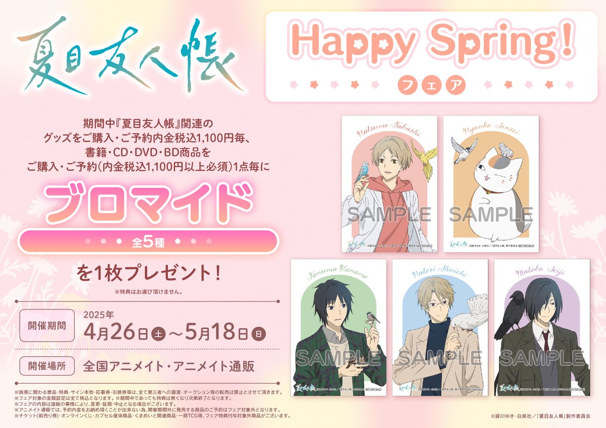 【フェア情報】 ‼フェアは5月18日まで‼ 「夏目友人帳」Happy Spring!フェア まもなく終了ですコォ❗️ 期間中、フェア条件を満たしたお客様に、特典≪ブロマイド(全5種)≫をプレゼント🎁✨ #夏目友人帳 🔻詳細はこちら🔻 animate-onlineshop.jp/contents/fair_…