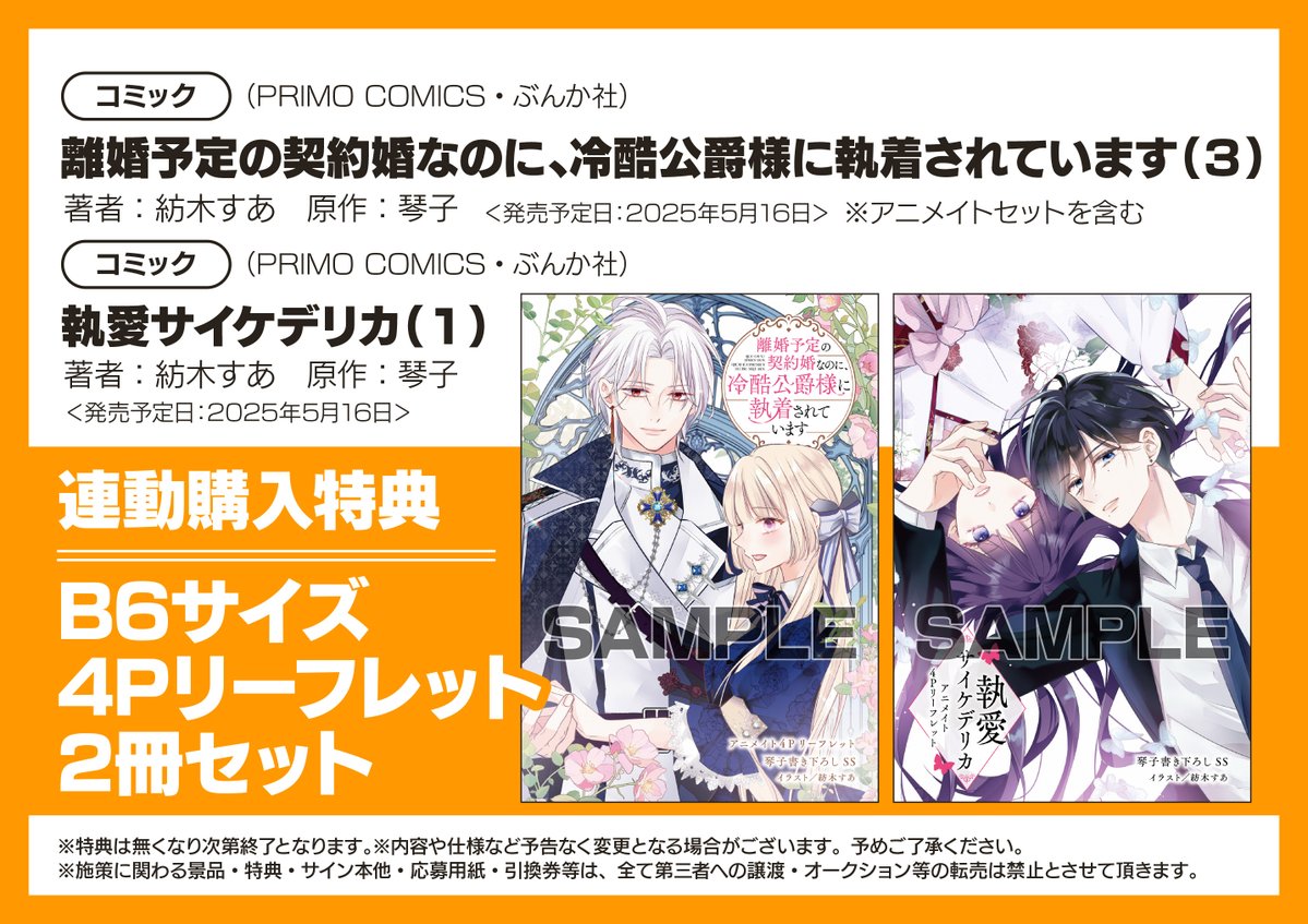 【書籍新刊情報】 『執愛サイケデリカ』1巻 『離婚予定の契約婚なのに、冷酷公爵様に執着されています』3巻 が入荷しましたコォ✨✨ 🎁連動購入特典【リーフレット 2冊セット】がございます。 新刊コーナーにて発売中‼️ #琴子 先生 #紡木すあ 先生
