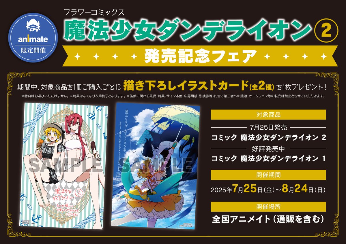 【書籍フェア情報】 7月25日より 『フラワーコミックス「魔法少女ダンデライオン 2」発売記念フェア』 の開催が決定ですコォ 期間中、対象商品1冊ご購入毎に【描き下ろしイラストカード(全2種)】を1枚プレゼント🎁 #魔法少女ダンデライオン 🔽詳細は下記の画像をチェック🔽
