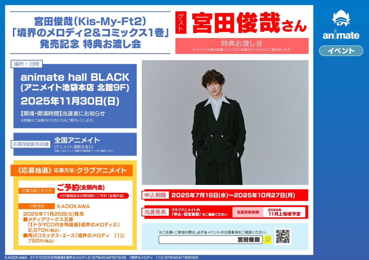 【イベント情報】 『宮田俊哉(Kis-My-Ft2)「境界のメロディ2&コミックス1巻」発売記念 特典お渡し会』 開催決定ですコォ🎵 対象商品を2冊同時にご予約(全額内金)いただいたお客様に【応募シリアル】をお渡し🎁 #宮田俊哉 さん #境界のメロディ 🔽詳細はコチラ🔽
