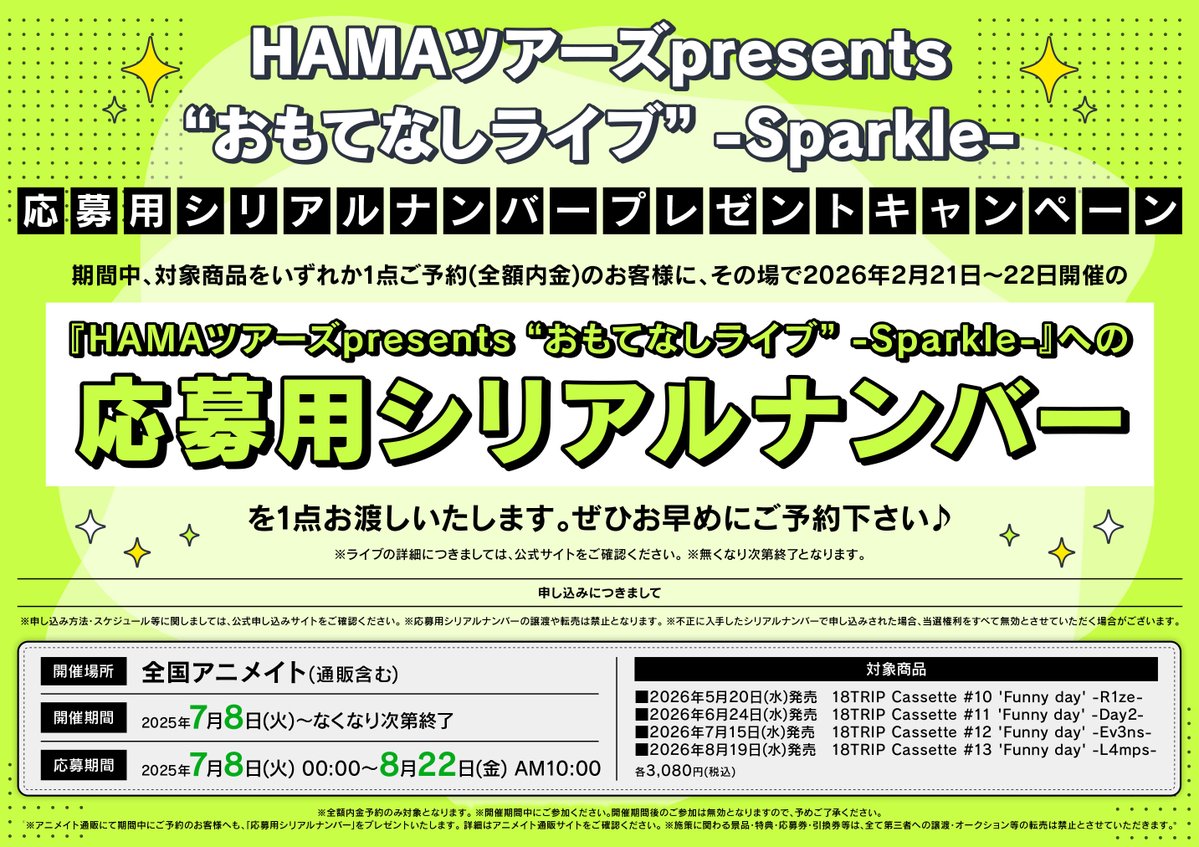 【フェア情報】 『HAMAツアーズpresents “おもてなしライブ” -Sparkle-』応募用シリアルナンバープレゼントキャンペーン 開催中コォ‼️‼️ 対象商品いずれか1点をご予約(全額内金)で《『HAMAツアーズpresents “おもてなしライブ” -Sparkle-』応募用シリアル》お渡し✨✨ 詳細は⏬POPをチェック