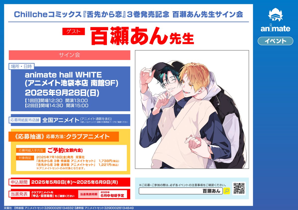 【書籍イベント情報】 『Chillcheコミックス『舌先から恋』3巻発売記念 百瀬あん先生サイン会』 開催決定コォ🎉 期間中、対象商品をご予約(全額内金)いただいたお客様に《応募シリアル》お渡し🎁 #百瀬あん 先生 #舌先から恋 🔽詳しくはコチラ🔽