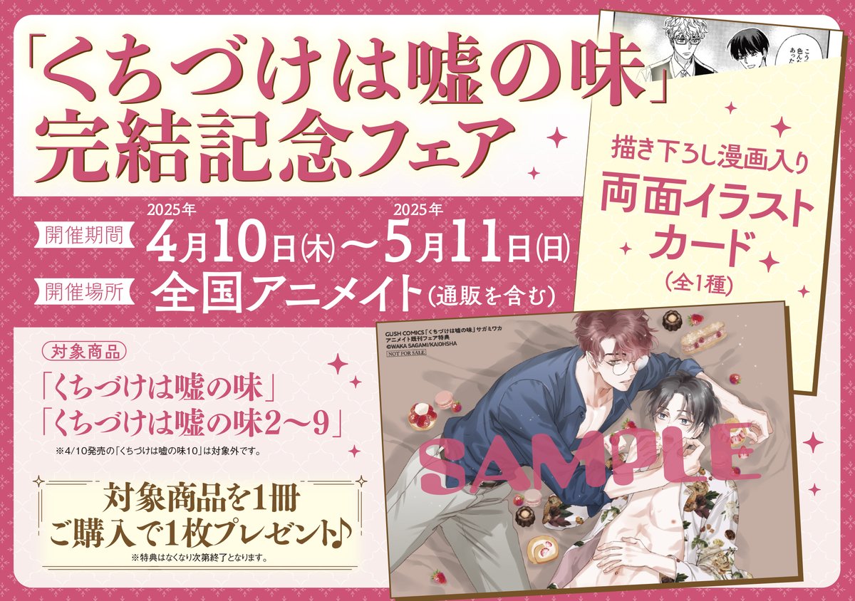 【書籍フェア情報】 間もなく終了‼️ 『くちづけは嘘の味完結記念フェア』開催中コォ🎉 期間中、対象商品を1冊ご購入ごとに 【描き下ろし漫画入り両面イラストカード(全1種)】を1点プレゼント🎁 #くちづけは嘘の味 🔽詳しくはコチラ🔽