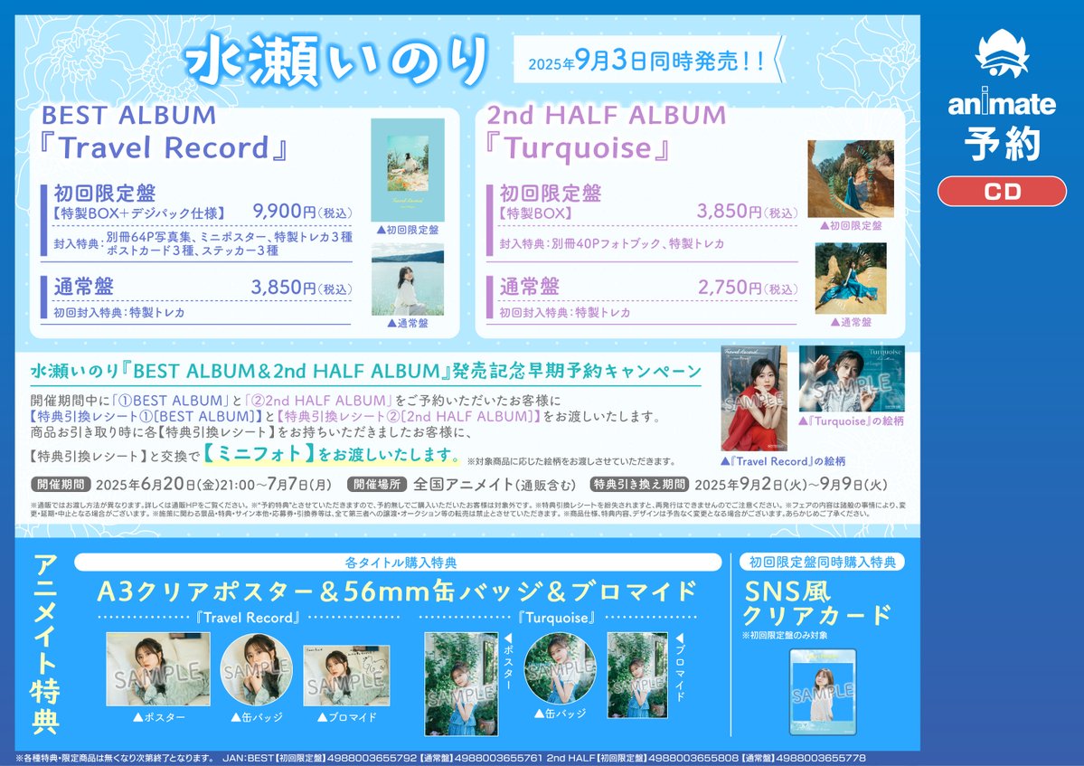 【フェア情報】 📣明日7/7(月)まで‼️‼️ 水瀬いのり『BEST ALBUM&2nd HALF ALBUM』発売記念早期予約キャンペーン 開催中コォ🎵🎵 期間中、対象商品をご予約いただいたお客様に商品お引き取り時ご予約タイトルに対応した【ミニフォト】をプレゼント✨✨ 詳細は🔽POPをチェック