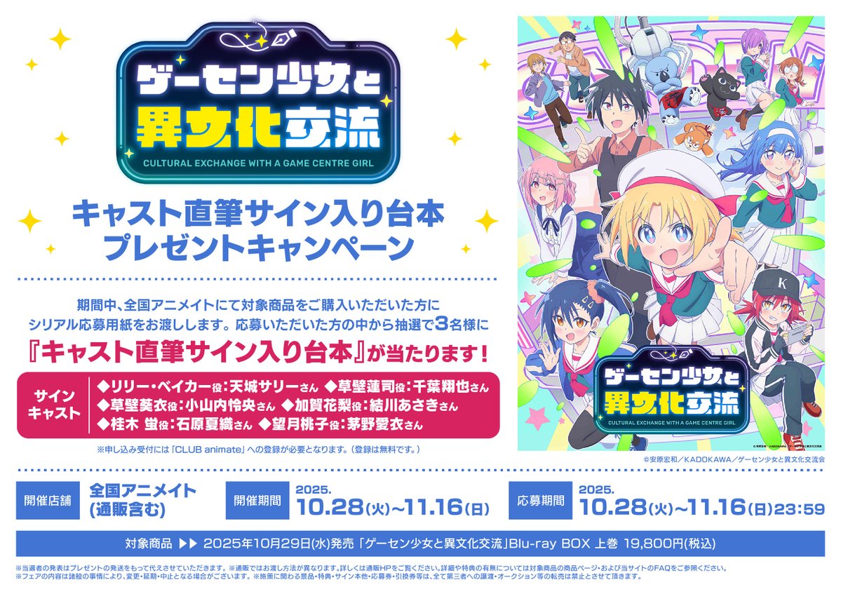 【フェア情報】 TVアニメ「ゲーセン少女と異文化交流」キャスト直筆サイン入り台本プレゼントキャンペーン 10/28(火)から開催決定コォ‼️‼️ 期間中、対象商品をご購入いただいた方にシリアル応募用紙をお渡しいたしますコォ✨✨ #ゲーセン少女 詳細は🔽POPをチェック