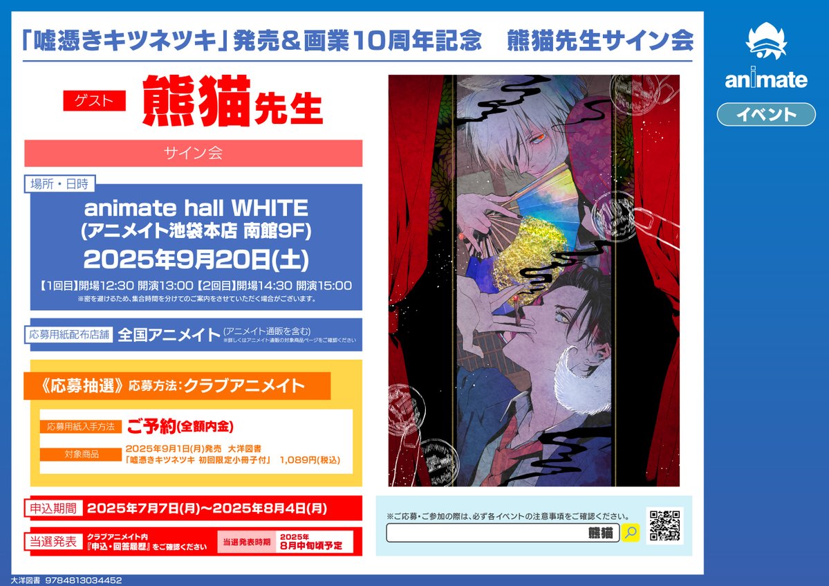 【書籍イベント情報】 『「嘘憑きキツネツキ」発売&画業10周年記念 熊猫先生サイン会』 の開催が決定ですコォ💕 #嘘憑きキツネツキ #熊猫 先生 🔽詳細は下記の画像をチェック🔽