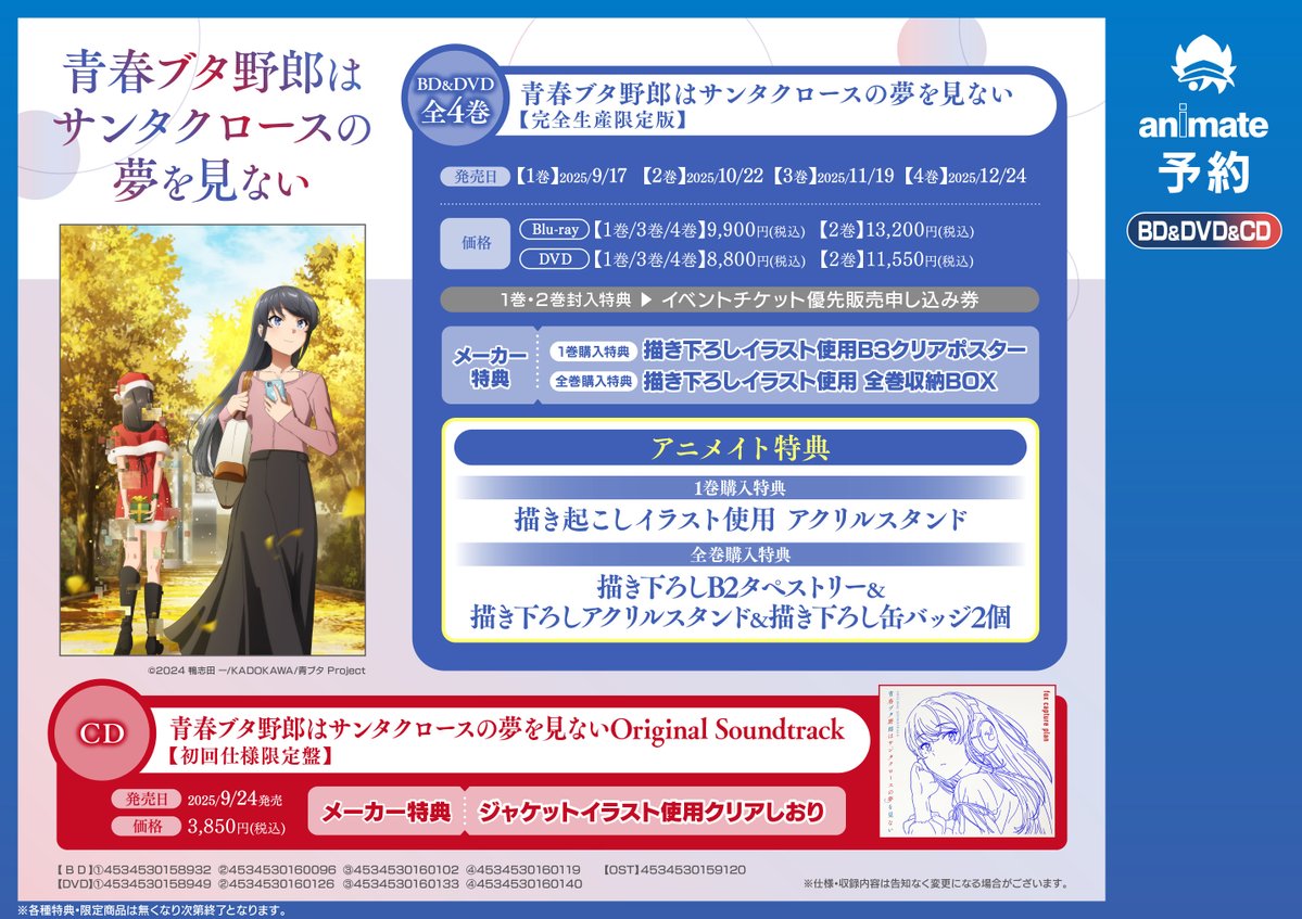【BD/DVD・CD予約情報】 TV 青春ブタ野郎はサンタクロースの夢を見ない ・BD/DVD【完全生産限定版】全4巻 ・CD:Original Soundtrack 予約受付中コォ✨✨ BD/DVDにはアニメイト特典、メーカー特典 OSTにはメーカー特典が付きますコォ #青ブタ ⬇️バーコード提示で簡単予約 animate-onlineshop.jp/pd/3165826/?ut…