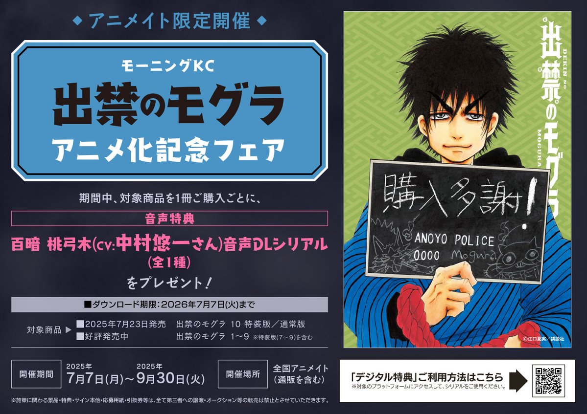 【書籍フェア情報】 本日より‼️ 「モーニングKC『出禁のモグラ』アニメ化記念フェア」開催コォ🎉 期間中、対象商品を1冊ご購入ごとに 【百暗 桃弓木(CV:中村悠一さん)音声特典(全1種)】のDLシリアルをプレゼント🎁 #出禁のモグラ 🔽詳しくはコチラ🔽