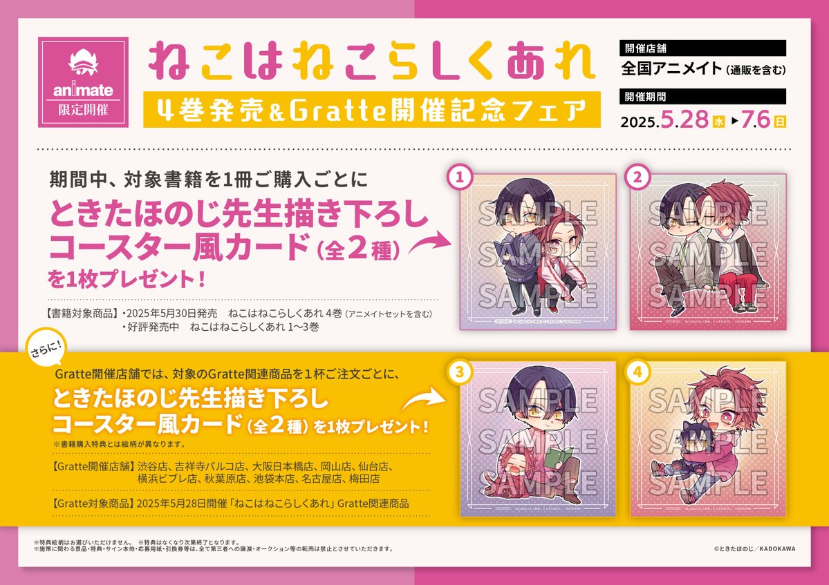 【書籍フェア情報】 『ねこはねこらしくあれ 4巻発売&Gratte開催記念フェア』 まもなく終了ですコォ🌟 期間中、対象商品1冊ご購入毎に【ときたほのじ先生描き下ろしコースター風カード(全2種)】を1枚プレゼント🎁 🔽詳細は画像をチェック🔽