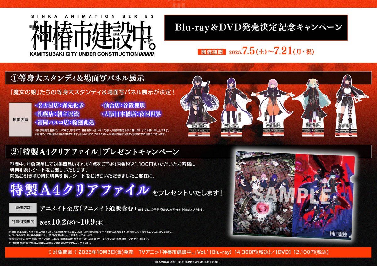 【フェア情報】 TVアニメ「神椿市建設中。」Blu-ray&DVD発売決定記念キャンペーン 明日7/5(土)より開催決定コォ‼️‼️ 郡山店は②「特製A4クリアファイル」プレゼントキャンペーンが対象ですコォ✨✨ #神椿市建設中 詳細は🔽POPをチェック