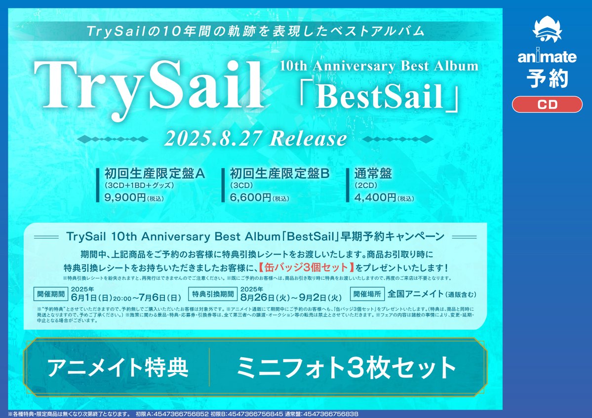 【CD予約情報】 #TrySail 10th Anniversary Best Album「BestSail」 予約受付中コォ🎵🎵 📢早期予約キャンペーンは7/6(日)まで‼️‼️ 🎁早期予約特典:缶バッジ3個セット 🔽バーコード提示で簡単予約 animate-onlineshop.jp/pd/3142799/?ut…