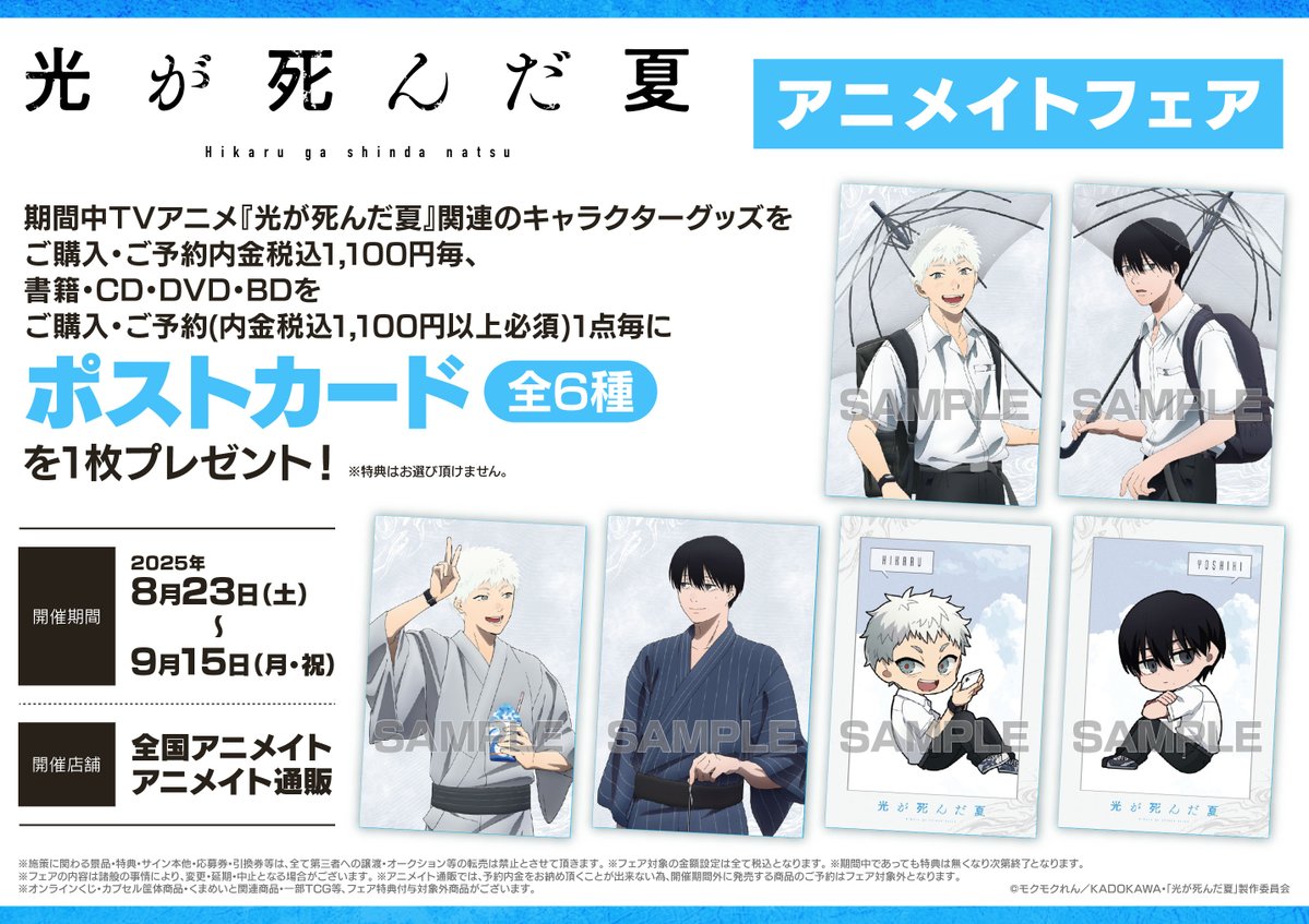 【フェア情報】 🎊8/23(土)より開催決定ですコォ🎊 『TVアニメ「光が死んだ夏」アニメイトフェア』 期間中、フェア条件を満たしたお客様に ≪ポストカード(全6種)≫を1枚プレゼント🎁✨ #光が死んだ夏 #ひかなつアニメ 🔻詳細はこちら🔻