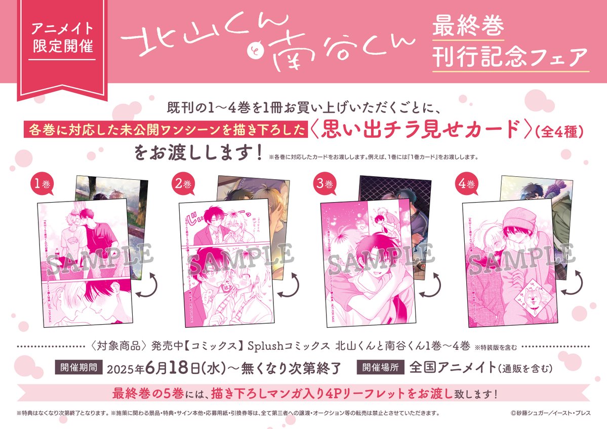 【書籍フェア情報】 「『北山くんと南谷くん』最終巻刊行記念フェア」 好評開催中コォ🎵 既刊の1~4巻を1冊お買い上げいただくごとに、【各巻に対応した未公開ワンシーンを描き下ろした思い出チラ見せカード】をプレゼント💕 🔽詳しくはPOPをご確認ください🔽