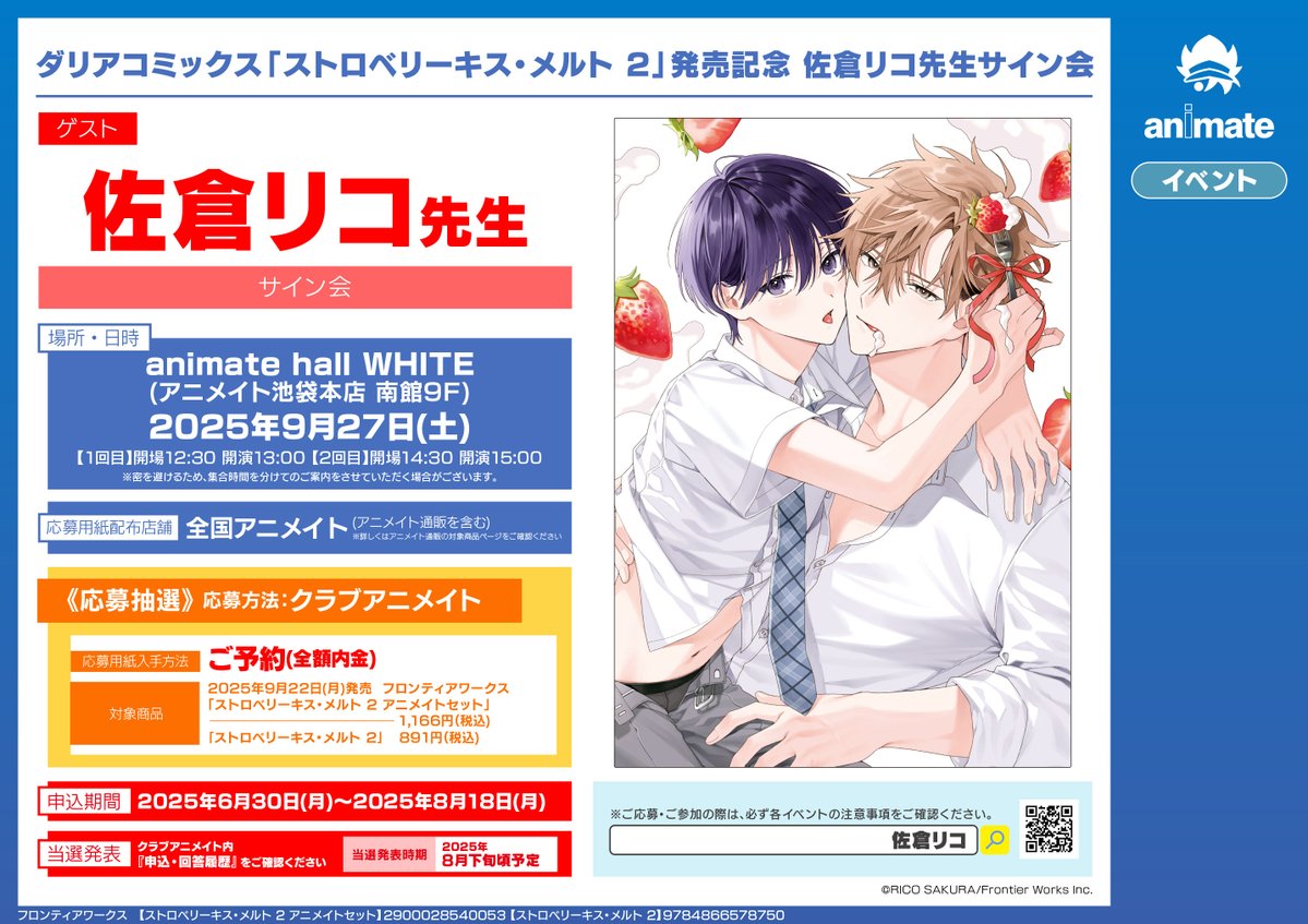 【書籍イベント情報】 『ダリアコミックス「ストロベリーキス・メルト 2」 発売記念 佐倉リコ先生サイン会』開催コォ🎉 期間中、対象商品を全額内金にてご予約いただいたお客様に、応募シリアルをお渡しいたします🎁 #佐倉リコ 先生 #ストロベリーキス・メルト 🔽詳しくはコチラ🔽