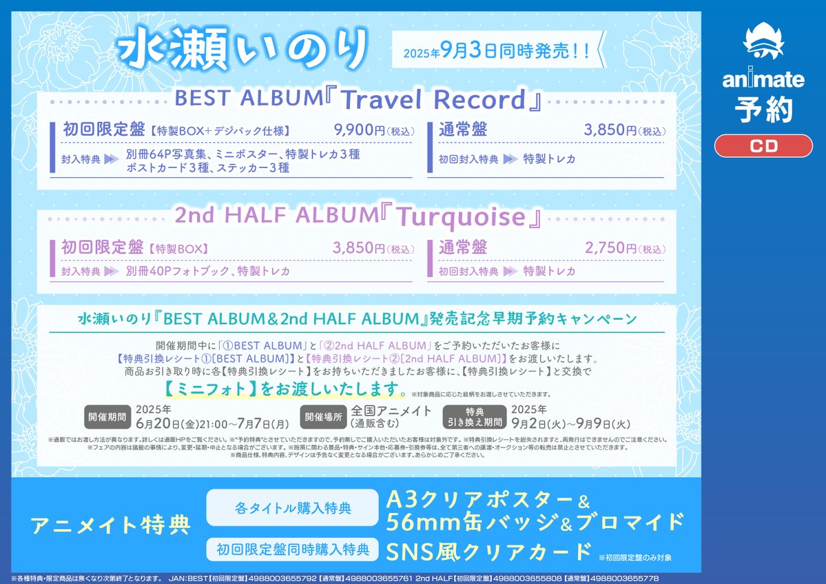【キャンペーン情報】 「水瀬いのり『BEST ALBUM&2nd HALF ALBUM』発売記念早期予約キャンペーン」開催決定コォ🎉 期間中、対象商品をご予約いただいたお客様に特典引換レシートをお渡し 商品お引き取り時に特典引換レシートと交換で対象商品に応じた《ミニフォト》をプレゼント 🔽詳しくはコチラ🔽