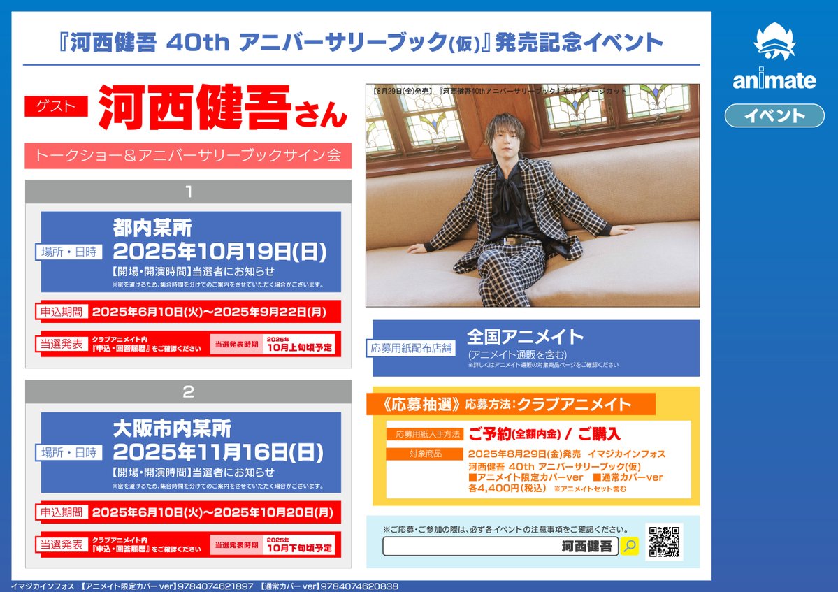 【書籍イベント情報】 「『河西健吾 40th アニバーサリーブック(仮)』発売記念イベント」 開催決定ですコォ❗️ 期間中、対象商品をご予約(全額内金)・ご購入いただいたお客様に【応募シリアル】をお渡し✨ #河西健吾 さん 🔽詳細はPOPをチェック🔽