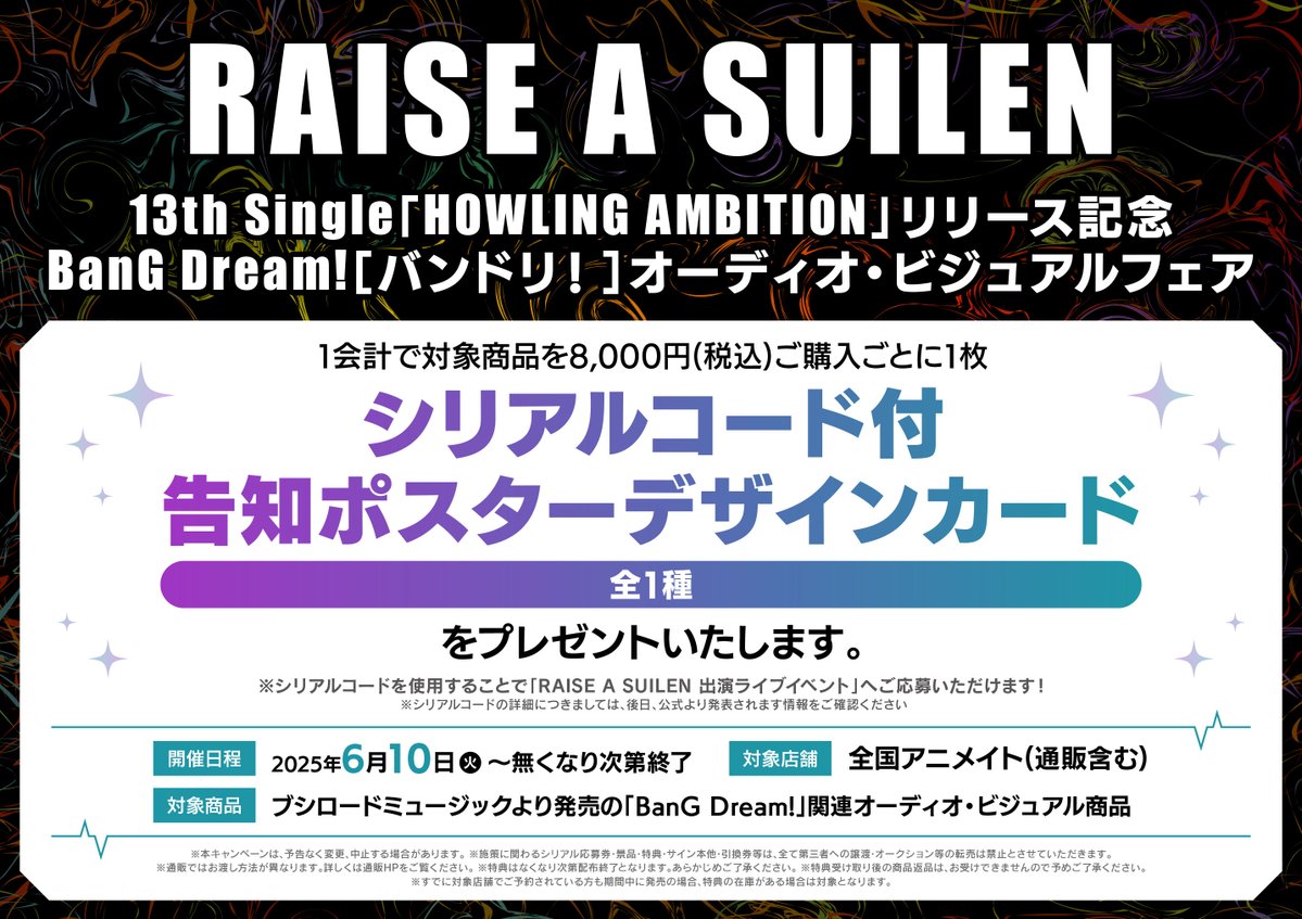 【フェア情報】 RAISE A SUILEN 13th Single「HOWLING AMBITION」リリース記念 BanG Dream![バンドリ!]オーディオ・ビジュアルフェア 本日より開催コォ‼️‼️ 1会計で対象商品を8,000円(税込)毎に1枚【シリアルコード付告知ポスターデザインカード】をプレゼント✨✨ #バンドリ 詳細は🔽POPをチェック