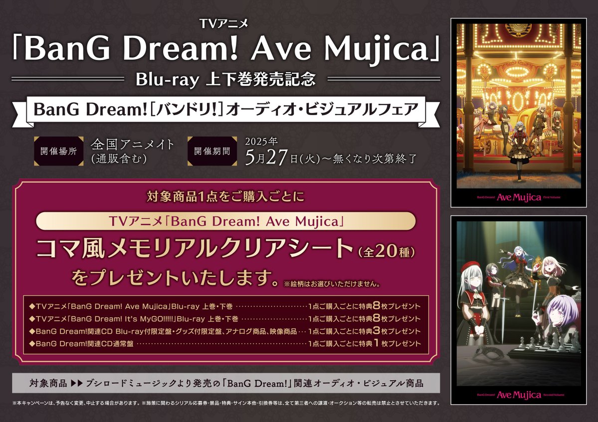 【フェア情報】 TVアニメ「BanG Dream! Ave Mujica」Blu-ray 上下巻発売記念 BanG Dream![バンドリ!]オーディオ・ビジュアルフェア 開催中コォ‼️‼️ 対象商品を1点ご購入毎に『コマ風メモリアルクリアシート』をプレゼントいたしますコォ✨✨ #バンドリ 詳細は🔽POPをチェック