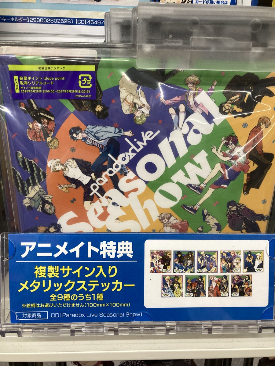 【CD入荷情報】 Paradox Live Seasonal Show 入荷しましたコォ✨✨ 🎁アニメイト特典:複製サイン入りメタリックステッカー 全9種のうち1種 ※絵柄はお選びいただけません 🎁封入特典:投票ポイント2,000pt(dope point)取得シリアルコード #パラライ