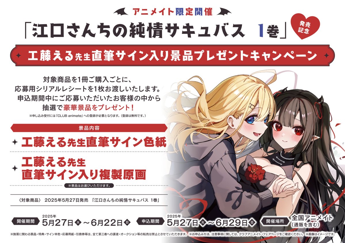 【書籍フェア情報】 本日より 『「江口さんちの純情サキュバス 1巻」発売記念 工藤える先生直筆サイン入り景品プレゼントキャンペーン』 が開催ですコォ‼️ #江口さんちの純情サキュバス 🔽詳細は下記の画像をチェック🔽