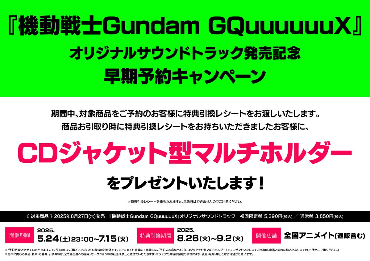 【フェア情報】 『機動戦士Gundam GQuuuuuuX』オリジナルサウンドトラック発売記念 早期予約キャンペーン 開催中コォ‼️ 期間中、対象商品をご予約されたお客様に商品お引き取り時、【CDジャケット型マルチホルダー】をプレゼントいたしますコォ✨ #GQuuuuuuX #ジークアクス 詳細は🔽POPをチェック