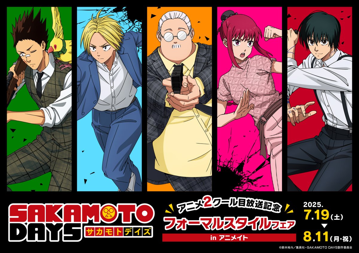【フェア情報】 7/19(土)より‼️ 「TVアニメ「SAKAMOTODAYS」フォーマルスタイルフェア in アニメイト」開催決定コォ🎉 期間中、関連商品をご購入・ご予約で 《ポストカード(全5種)》を1枚プレゼント🎁💕 #SAKAMOTODAYS #サカモトデイズ 🔽詳しくはコチラ🔽